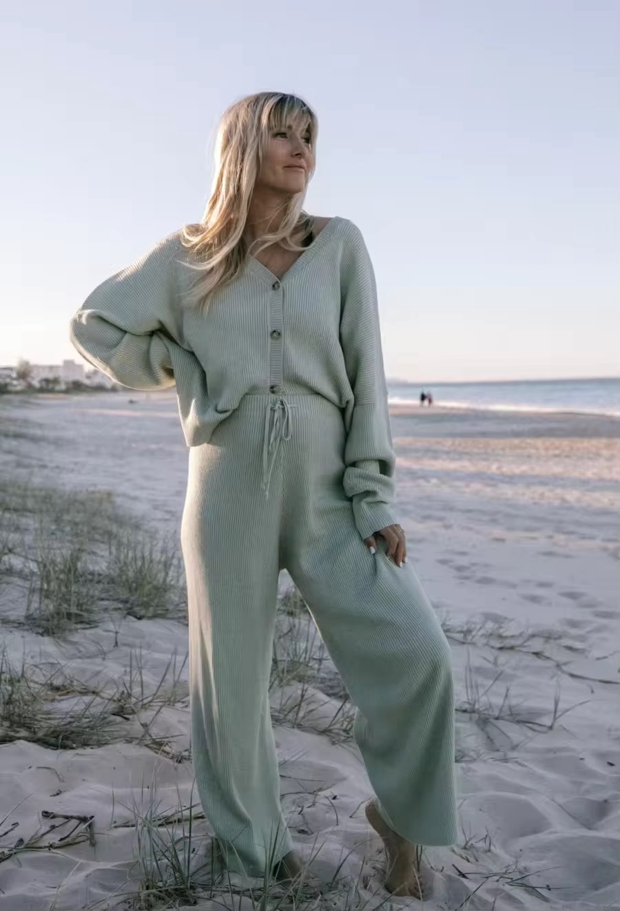 This soft-touch outfit includes a button-down cardigan top paired with wide-leg drawstring pants, giving you a relaxed yet premium look. The breathable fabric and minimal design make it ideal for all-day wear.